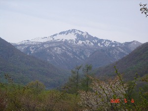 キャンプサイトから仰ぎ見る那須連峰。 これは旭岳でいいのか?よく分からず。 GWでもまだまだ残雪がしっかり。 |