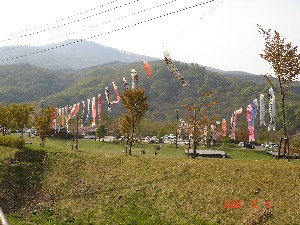 こどもの日ということでこいのぼりがたくさん遊泳中。 いい初節句だなーと、親は満足。元気に育てよー。 |