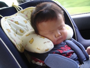 今回の新兵器、ユン専用枕。移動中の睡眠も快適?あまり効果がないようにも見えるのであるが。 |