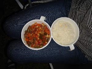 本日の夕食。ご飯と鶏肉のトマト煮?途中でダッチをひっくり返してしまったため、 量が減ってしまったが、それでも腹一杯になった。車はするし、どうも注意力が切れてる感じ。 |