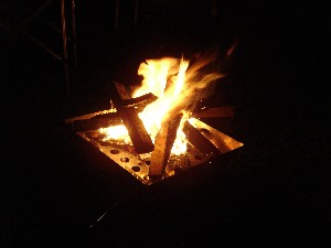 焚き火。炊事棟横に捨てられていたやつを拾ってきた。普通の薪なのですぐに燃え尽きて終了。 |