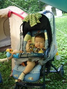 キャンプ場周りの散策へ出発。ユンを背中に乗せて自然の中を歩くのは初。 ベビーカーでは行動範囲が狭いので。いつまで背負えるかなー、既に9kg超えてるから。 |