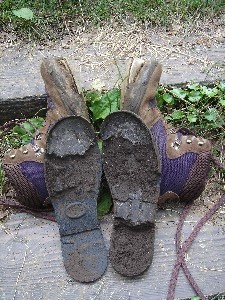 壊れてしまったトレッキングシューズ。ソールが取れるとは想定外。 なんでも昔の接着剤は加水分解してぐずぐずになるんだそうだ。 約10年間山に旅行に頑張ってくれました。 |