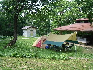 テント設営後。場所を探して結局炊事棟の目の前にしてしまった。 場内は広いんだけど、あまり平らなところが無いのと、水場の近くにしたくて。 |