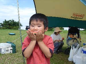 滞在記 今年2回目の背あぶり山キャンプ場。今回はうちの料理長の妹さん夫婦との二家族合同キャンプ。 人数が増えるとユンも構ってもらえる時間が多くなって楽しいよう。天気も良く、良く食べ、良く 遊んだキャンプでした。 第1日 朝9時半過ぎに埼玉から妹さん夫婦が郡山に到着。どーもお久しぶりです。早速荷物を積んで、 ほとんど開店とともに食材を買出し。人数が多いときはとりあえずBBQでしょうということで、 食材とビールを買い込んで出発。ま、僕は忘れ物を取りに帰ったりしてたので、どんな食材が 積み込まれたのか知らなかったんですが・・・。途中猪苗代湖近くの強清水で名物といわれる蕎麦を 昼食に頂く。蕎麦はまあよかったのだが、これまた名物という天ぷらがねー・・・イカとニシンと饅頭、 いずれも独特の天ぷらになっておりました。腹ごしらえを終えてもう一走りでキャンプ場に到着。 約一ヶ月振り、またお世話になります。今回は到着が早かったので、ちゃんと手続きして、 許可証ももらってキャンプサイトへ。本来はこうするべきなのね。 キャンプ場はなかなかいい天気。前回よりも磐梯山や会津平野がはっきり見えました。 サイトには誰もおらず貸し切り状態。夕方ライダーさんの二人組みがやってきたけど、結局 それだけで、山頂の芝生を占領状態で、妹さん夫婦の3歳になるお子さんも遊び放題。 元気いっぱい動き回って、時にあちらのパパに怒られ、時に泣きながらも楽しんでたよう。 早くユンも一緒に遊べるようになるといいねー。テントを張るところも選び放題。 今回は久々登場の青テントも加わって、全部で3張。いやー、見た目はいっぱしのキャンパーぽく なってきたじゃないですか、ねぇお客さん(誰?)。そんなこんなは置いといて、テント設営後 汗を流しに背あぶり山の麓の東山温泉へ。時間によって開いているところが変わるということで、 温泉組み合いお勧めという不動滝旅館へ行く。お値段は一月前に入った東山第一ホテルの倍。 雰囲気はこの前より良かった気はするが、高いよねー。東山温泉街、基本的に一般的な 温泉の二倍ぐらいのお値段の印象。 さっぱりしてからサイトへ戻り、夕食の準備。今晩の夕食はBBQとシーフードリゾット(風炊き込みご飯)。 大人が増えるといろいろ楽できていいねー。ユンもみんなにかわるがわる相手してもらえてご機嫌だし。 すっかり満足したのか、いつに無くおとなしく8時に就寝。ガスが出てきて星も夜景も見えなかったのが 残念だったけど、平和に夜は更けてゆき、11時前には大人も就寝。 一月前より涼しいぐらいで、意外と虫もおらず夏でも結構快適ですなー。 第2日 夜中、昼間興奮したのか何なのか、ユンが夜泣きを頻発。こちらは寝不足。 思わぬ落とし穴でした。その後家に帰ってからも相手しないとすぐ泣くように。 すっかり遊んでもらえることに味をしめちゃったかなー。 少々寝不足ながらテントの外にでると、既に隣のライダーさんはテントがたたまれておるではないですか。 どちらさまもえらいですねー。さわやかに挨拶をされて彼らは走り去って行きましたとさ。 こちらは昨日のリゾットの残りを食べたあと、男たちはママ組みに昼食を託して サイトからちょっと降りた所にある広場へ。アスレチックのある広場は家族連れで賑わってました。 先週壊れたトレッキングシューズの代わりに買ってしまったニューシューズも快調。 やっぱり底があると違うね(当たり前)。一歩きしてサイトへ戻ると昼食がばっちり出来てました。 そういえば、一緒に歩いたユンのいとこ君、途中で駄々こねながらもちゃんと自分で歩いたのだが、 パパさんの指導がなかなか厳しい。これからうちも見習わないと。小さいときの躾、大事ですよねー。 昼食はエビときのこのピラフ風炊き込みご飯+イカとキャベツの炒め物。ダッチで作ると全部炊き込み ご飯になってるような気が・・・。どうやったらパリッとするんでしょうか? 昼飯を食べてからゆっくり撤収作業。天気も朝曇ってたのが回復して、テントも寝袋も良く乾く、乾く。 あらかた片付けたところでスイカ登場。ユンもそのままのスイカに挑戦。もぐもぐやってました。 満足したところでもうひと働きして、撤収完了。最後に展望台に行こうとしたら階段が閉鎖されてた。 あれま残念。確かに建物壊れかけなんで危険度は高かったけど、上がれなくなるのは残念。 出発したのは2時半ぐらいだったか。妹さん家族は埼玉まで戻らないといけないので、 お疲れ様でした。また是非ご一緒に、よろしくお願いします。 2005.7.24記 背あぶり山キャンプ場関係リンク 前回('05.07)の背あぶり山キャンプ記録 ・・・施設等の感想についてはこちらへ。 会津 東山温泉 ・・・東山温泉のHP |