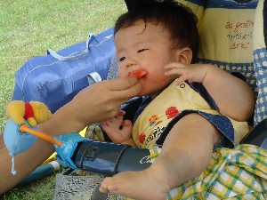 なんともすごい格好でスイカを食べてます。 その足、行儀悪いですよー。 |