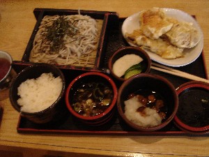 これが名物ざるそば定食。天ぷらが饅頭、スルメ、ニシンといずれも個性派揃い。 1050円ですがボリュームも満点。元祖と本家が並んでいるのは良くある光景か。 |