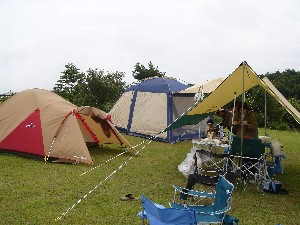 本日のテントサイト。しばし眠っていた青テントが登場。 穏やかな天候の時には十分活躍できます。 |