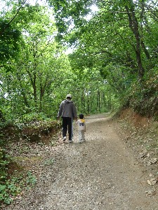 林道を歩いて広場まで。いとこ君は厳しいパパに鍛えられながら歩いてます。 |