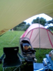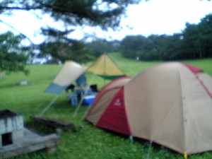 今回の設営状況。ヘキサタープ初登場。張り上がりが今ひとつで、しわが無くならなかった。 タープの説明ビデオなんてものがついていたので帰ったら見てみよう。 |