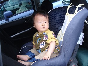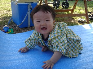 一夜明けてもご機嫌のユン。敷いたマットから這って出るようになってしまい、 もう目が離せません。 |