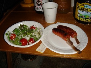 ビールのつまみとなったソーセージとサラダ。ソーセージなかなか美味かった。 |