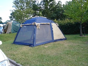 二区画借りたものの、一区画は寝床用テントだけなのでさみしめ。一区画に入りそうだったけど、 車一台に付き一サイト借りないといけないらしい。 |