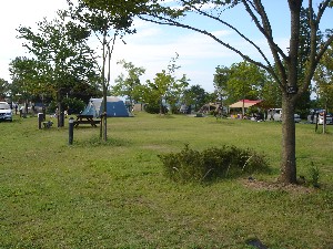 で、炊事棟の横だったキャンプサイト。広い芝のサイト、流し付き。 |
