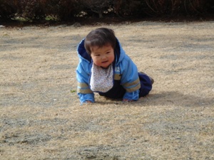 芝生の上で朝の運動。天気も良くて気持ちいい。 |