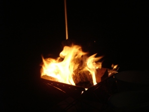 焚き火。まったりしてると霧雨が。ちょうど涼しいぐらい。 |