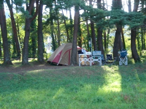 ロケーションのいい浜辺の松林がテントサイト。 |