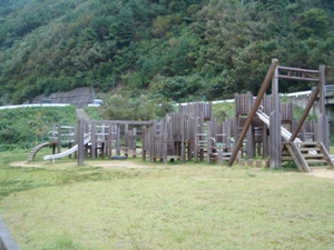 キャンプ場へ行く手前あったアスレチック広場。風が強くて早々に退散。 |