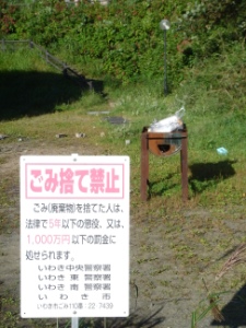 ゴミ捨て禁止の看板のすぐ裏に捨てられたゴミ。さすがにこれはないんじゃなかろうか。。。 |
