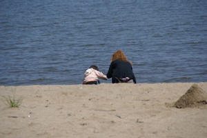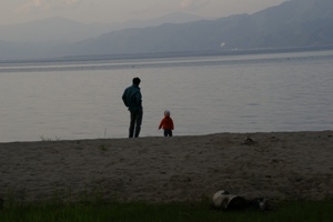 暮れなずむ湖畔にて。焚き木も採取。 |