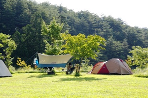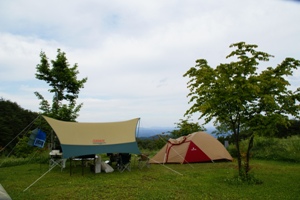 フリーサイトの一番奥に設営。日差しをさえぎるものがないのでタープの出番。 |