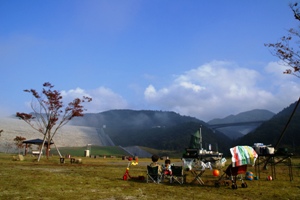 滞在記 “今週はどこいくの?”“そうねえ、出発も遅いし久し振りに福島のキャンプ場開拓に行こうかね。” お出掛け日和が続く秋の週末、キャンプ、キャンプというユンがいるもので(笑)いそいそと出発。 第1日 最近出発が遅い我が家。今週も嫁さんが午前中バタバタしていたので午後から出発。今年は秋山浜か県外かの 両極端だったので久し振りに県内の新キャンプ場へ。なかなか県内で行きたいところがなくなってきてて困ってる とこであるがなかなかよさ気な茂庭広瀬公園キャンプ場へ出発。出発が14時過ぎだったので時間短縮のため 休日半額になった近距離高速道路を利用、900円也。ガソリンの値段も一時期に比べれば下がってきて ちっとは遠出しやすくなった感じ。CO2削減が叫ばれている時代には逆行している感もあるが、じっとしてられない 我が家には朗報ですな。 ショートカットのおかげもあり一時間半ほどで公園に到着。まずは茂庭生活歴史館に行って受付。 福島市のHPだと事前に申し込みがいるような感じだったが当日空きを確認して直接茂庭生活歴史館に行けば 大丈夫だった。キャンプ場はただの広場でフリーサイトと思いきや場所が決まっているらしく受付時に区画を 選んだ。が、サイトに着いて見てみてもどこがどの区画かよく分からないのでなんとなくこの辺?て感じ。 まあ我が家以外に誰もいないのでどこに陣取っても誰も文句言わないでしょうが。 キャンプ場は温泉もにわの湯や蕎麦屋の茂庭ふるさと館、多目的広場、親水広場などがきれいに整備された 茂庭広瀬公園の一角にある広い草地の広場。トイレと水場があるだけの簡素ないずれもきれいに管理されていて ダム直下の開放感のあるロケーション。これが無料かつ独り占めとはなんとも素晴らしいじゃありませんか。 今回は車中泊なので設営もほとんどなく楽ちん。子供たちは誰もいないサイトを縦横無尽に動き回ってひと暴れ。 最近結構二人で仲良く遊ぶようになってきたのだが、アパートで騒がれると周りが気なってしまう。その点、 人のいないキャンプ場はどんだけ騒いでくれても気にならないのがいいねー。 夕食は焼肉、焼鳥、焼芋の三焼きに厚揚げチーズ挟みと豚汁・・・食べすぎ?満腹になり、ほろ酔い気分で 気持ち良くなったところで温泉へ。歩くとちょっと離れてるんだが満天の星空を見ながら温泉に行くのも悪くない。 温泉は21時までやっていて1人250円とキャンプ場同様リーズナブル。内湯はお湯が熱くて入れなかったけど、 露天だとちょうどいいぐらいだった。せっけん類はないので持っていく必要あり・・・と事前に言ったのに忘れた 嫁さんのような方は受付で購入下さい(笑)。さっぱりして防寒対策もしたところでサイトに戻って早めの就寝。 第2日 翌朝、6時過ぎから駐車場で何やらがたごとやっている音がして起こされる。たまたま“森づくり大作戦”という 植林イベントが行われる日だったらしく、朝早くから準備作業をやっている音だった。外に出ると辺りは朝もやで 白かったがしばらくすると晴れて気持ちのいい青空が広がり、秋のすがすがしい空気のもと朝食を頂く。 朝食食べてしばらくするとイベントに参加する人や芋煮をする人々がやってきて急に周りが賑やかに。 なんとなく落ち着かない感じの中ひとまず片づけを行った後、せっかくなので森づくり大作戦に参加。 森づくり大作戦、植林するといってもかなりお膳立てがしっかりされていて、どんぐりや苗木をちょっと穴掘って 植えていくだけなのだが、ユンが参加するにはちょうどいい感じ。後で見たらしっかりイベントのHPにユンが 載ってた。いっちょまえにやろうとする姿がカメラマンの気を引いたかね(笑)。森づくり大作戦が小一時間で 終わったあとダムの監査廊が公開されたので日頃は入れないダムの中を見学。ダムの最深部まで階段を下りて 浸透流なるものを見た後反対側にあるエレベーターに乗ってダムの上に出て周りを見物。結構でかいので ユンやリョンをつれて歩くのは結構大変だったが、ダムの中入ったの初めてだったのでへーって感じ。 ダム見物の後、もにわの湯の横でやっていたそばまつりに寄って昼食。そばまつりはいまひとつだったなあ。 昼食後ダムから鳩峰峠まで走って紅葉見物と米沢市外を眺めた後帰宅。温泉付き無料キャンプ場にイベントまで ついてきて随分楽しませてもらいました。家から近いし、ここはまた来たいねえ。 2008.11.8記 茂庭広瀬公園キャンプ場関係リンク 摺上川ダム管理所・・・茂庭広瀬公園のある摺上川ダムのHP。 |