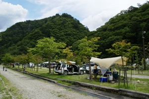 グリーンビレッジ〜塩原密集テント村。一区画が狭いので、テントとヘキサを張るにはつらい。 |