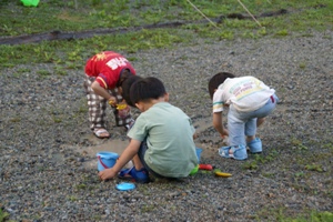 子供達は水たまりで泥遊び。