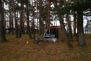 ロケーションのいい浜辺の松林がテントサイト。 |