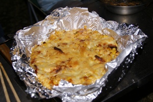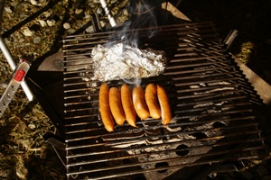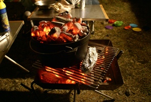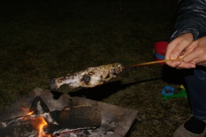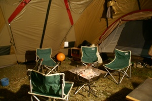 | 寒いので昨夜の残った炭に火をつけ暖をとる。 |