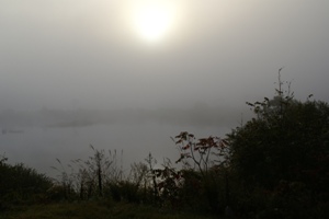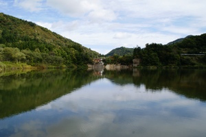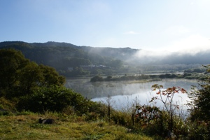 | しばらくして靄が晴れ、朝日に輝くダム湖が現れた。 |