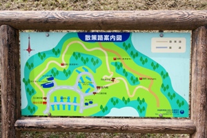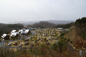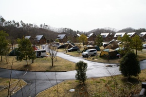 散策路途中の展望台からサイト全景。里山を切り開いて作ったキャンプ場といった風情。 どの施設もきれいで温泉、プール、公園、イベントと盛り沢山なのが人気の訳でしょうか。 |