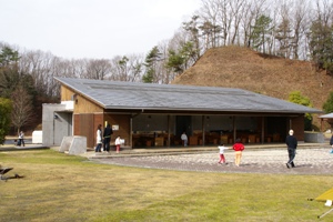 バーベキューサイト。隣に小さな遊具がある。 |