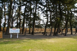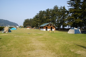 | 今回利用したフリーサイト。広い芝生の空き地といった感じ。右側の松林の奥がヒスイ海岸。 |