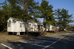 | 高床式テントサイトは海側のロケーションの良いサイトもあり。ただ風が強いためか 最初海側に設営していた家族がいつの間にか反対側に移動してた。 |