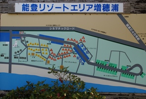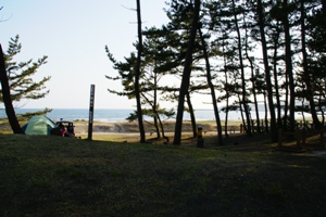 | 増穂浦海岸に隣接する横に長いレイアウトのキャンプ場。 |