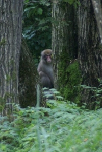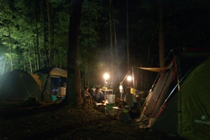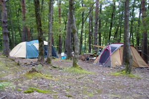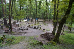 林の中の傾斜地で、平で広い場所があまりない。 設営した場所は一番下のところで荷物運びも結構大変。 |