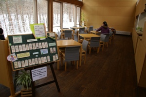 ビジターセンター。 受付、売店、温泉、図書コーナー、カフェと施設充実。 |