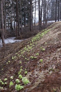 | サイト裏の土手にたくさんのふきのとう。もうちょっと時期が早かったら食べ頃だったか(笑)。 |