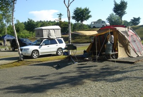 フリーテントサイトとなっているが区画サイトの感じ。写真の左右の山側のサイトの方が 日が当らない時間が長いので涼しそう。 |
