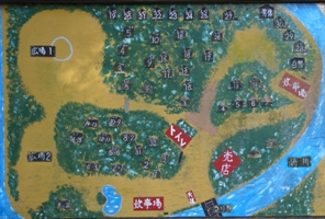 | 場内の案内板。広いサイトだがトイレは1ヶ所、炊事棟は2ヵ所のみ。 |