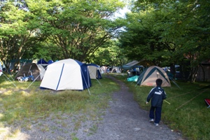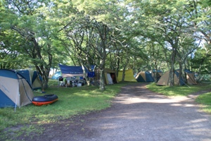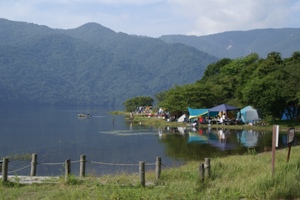| サイト風景3。中禅寺湖と男体山が望めるローケーションのよいところ。今回は湖畔に面したところは 既に埋まっていて設営できず。 |