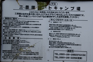 | キャンプ場の看板。受付時にクリアファイル入りの案内書をもらった。 |