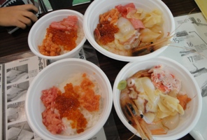 市場で好きな具材を載せて作るオリジナル丼、皆ご満悦。 |