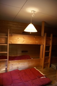 バンガローのベット、二人が縦に寝る見慣れない2段ベット。