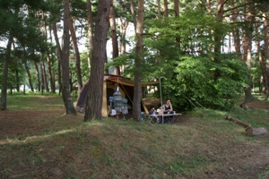 松林の中の設営風景。