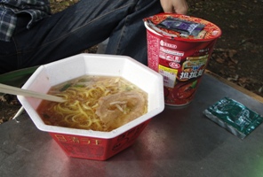 | 昼食のカップラーメン。設営前の腹ごしらえ。 |