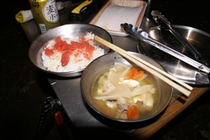 明太子ごはんと豚汁。ほかに焼き芋とサバで和な感じ。 |