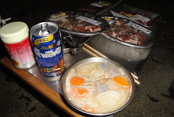 | あっという間に豚汁出来上がり。あとは焼肉とビールで乾杯。 |