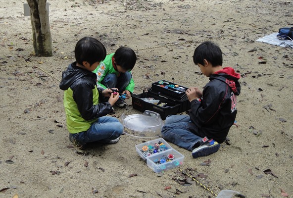 | 撤収中もベイブレードに興じる子供たち。すっかりやっていなかったのだがユンのベイブレード熱が再燃。 |